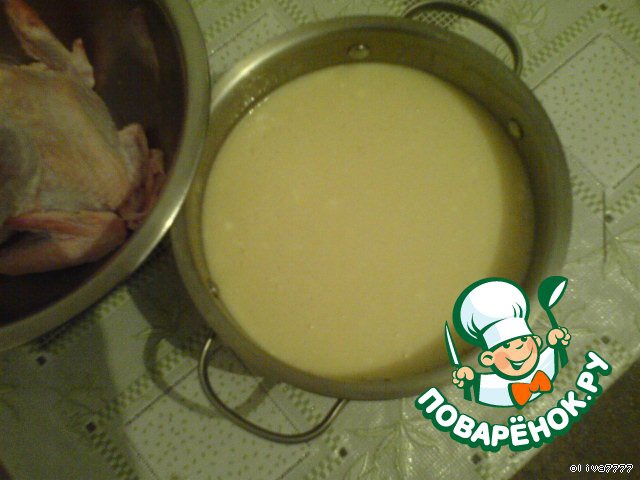 Приготовить начинку из 15 яиц, растопленного масла, сметаны и соли (можно яиц брать меньше или больше в зависимости от размера курицы и всего остального, соответственно. У меня была небольшая курица 1200-1300 г).