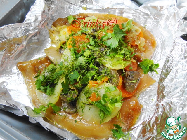 Края фольги приподнимаем по кругу и слегка защипываем. Это необходимо сделать для того, чтобы сок остался внутри.