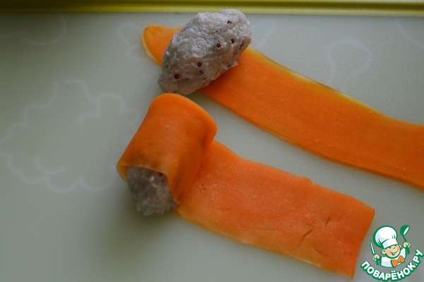 Тыкву почистить и нарезать на тонкие полоски. Я резала с помощью овощечистки. На край полоски выкладывать немного фарша, сворачивать рулетом.