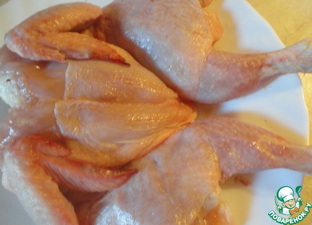 Цыплёнка режем по спине. Вырезаем хребет. Откладываем его для бульона (кидаю к другим куриным "запчастям" из которых варю бульон). "Попку" на цыпе я оставила. Распластываем тушку как показано на фото.