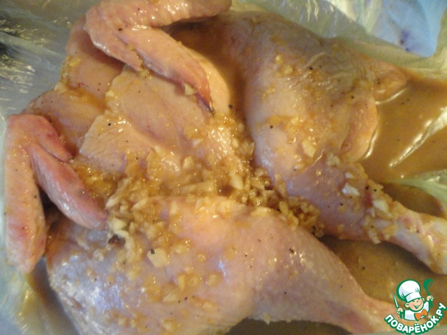 Берем целый полиэтиленовый пакет. Помещаем туда цыплёнка и заливаем маринадом.
