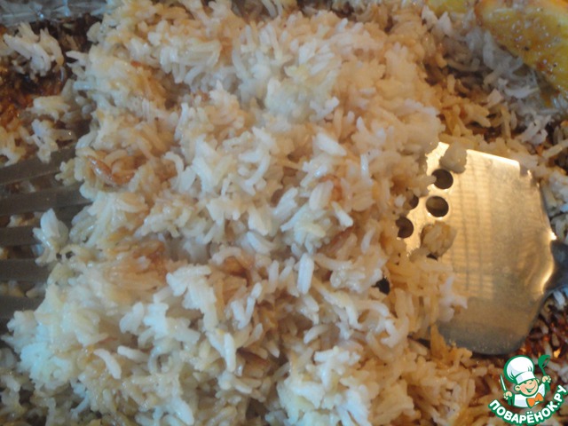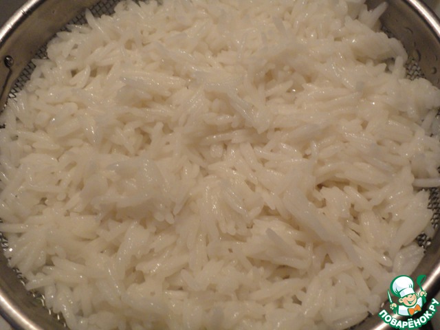 Перед запеканием цыплёнка. Отвариваем рис до полуготовности. Нужно взять рис с маленьким содержанием крахмала (басмати, жасмин). Внешне он полупрозрачный, а не молочно-белый. Рис заливаем кипятком, слегка подсаливаем. Варим под крышкой на медленом огне около 7 минут. Откидываем на дуршлаг. Промываем холодной водой, чтобы остановить процесс приготовления риса.