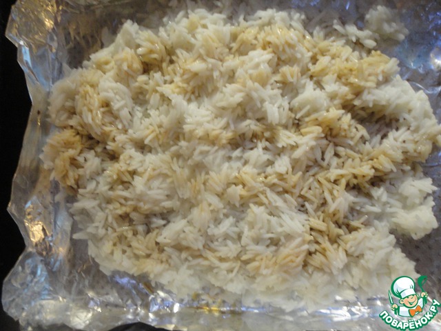 Выкладываем рис. Сбрызгиваем его 3-мя ст. л. соевого соуса.