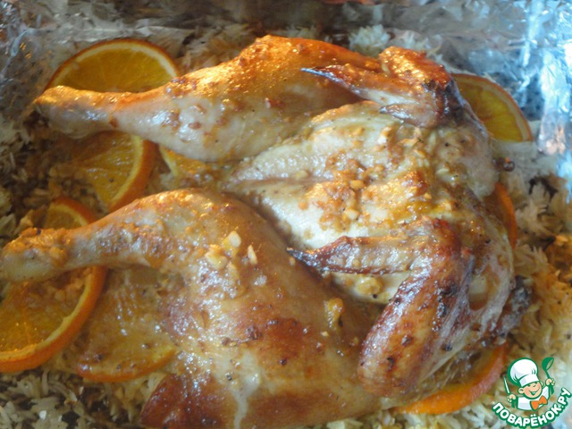 Выкладываем рис вокруг курочки. Сверху риса - апельсины. Можно подавать!