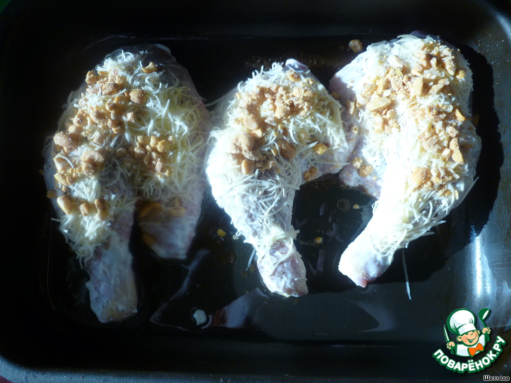 Поперчить, немного посолить. Посыпать тертым сыром и измельченным арахисом. Запекать в нагретой духовке 200 град. 40-45 мин.