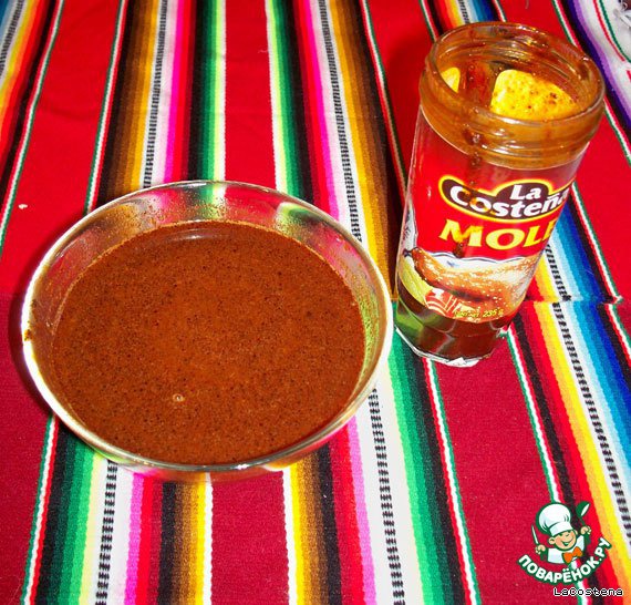 | Курица в соусе Моле - это традиционный рецепт мексиканской кухни. Моле по праву является изюминкой мексиканской кухни. Считается, что появлению этого продукта способствовал приход испанцев, которые привезли с собой продукты, никогда не встречавшиеся на американском континенте, таких как кунжут и лук. В состав соусов Моле входят сотни ингредиентов. Наиболее значимыми являются шоколад, орехи, перец и десятки специй. Моле это прекрасный соус для блюд из птицы. |