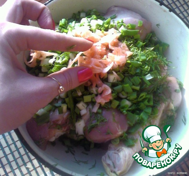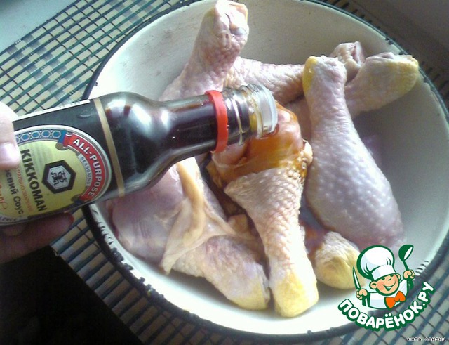 Куриные голени помыть, залить соевым соусом. Порезать имбирь, зелень, добавить васаби и оставить мариноваться на часик. Не солить. Получился тонкий аромат восточной кухни - необычно и очень вкусно.