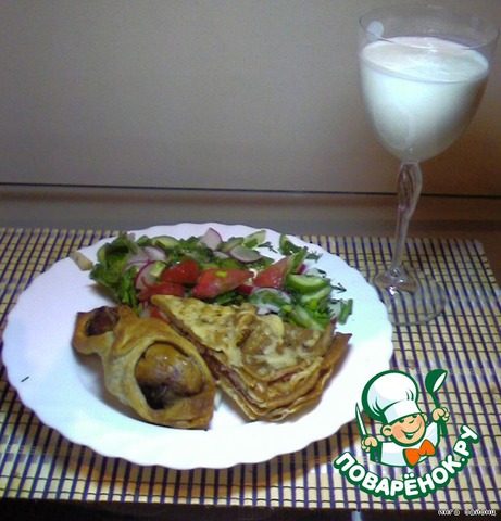 Вот такой у нас был ужин - кусочек блинного пирога, курочка, салатик и кефир. Недорого, нарядно (если кефир налить в красивые бокалы) и сытно.