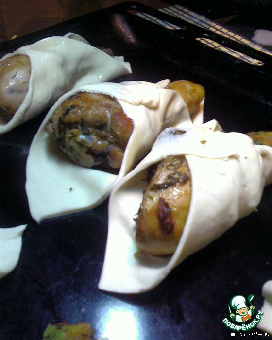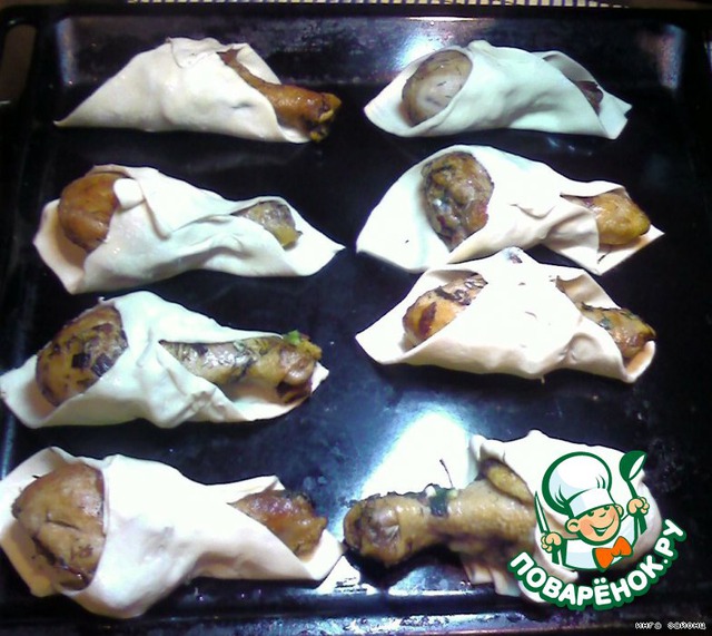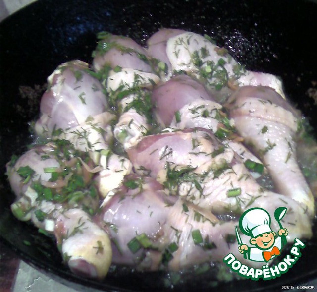 В раскаленном масле обжарить ножки до золотистого цвета. Я побоялась их сырыми запекать - тесто готовится минут 15, а ножкам провести в духовке нужно больше.