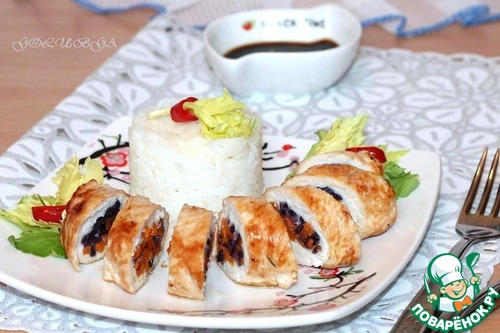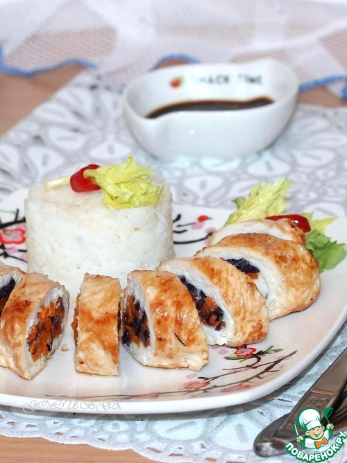На узкий край филе положить порцию приготовленных овощей и завернуть рулетиком.