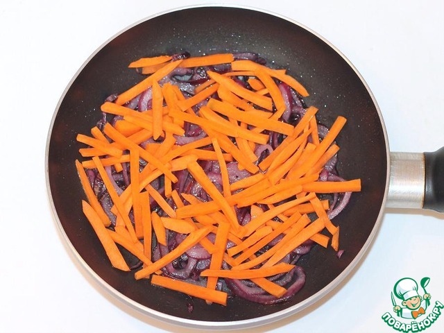 и морковь почистить и нарезать длинной соломкой. Спассеровать на оливковом масле.