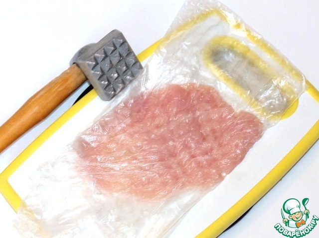 Филе курицы разрезать на 2 или 3 части вдоль (в зависимости от толщины филе), чтобы получились тонкие пластины.