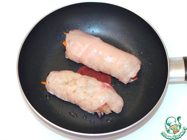 Положить куриные рулетики на разогретую с оливковым маслом сковороду швом вниз. Жарить на среднем огне, подрумянивая куриные рулетики со всех сторон, примерно 6-7 минут.
