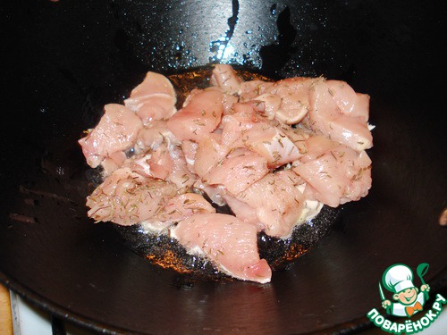 Разогреть растительное масло в сковороде (у меня вок) и обжарить курицу до золотистого цвета.