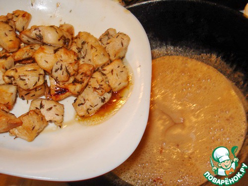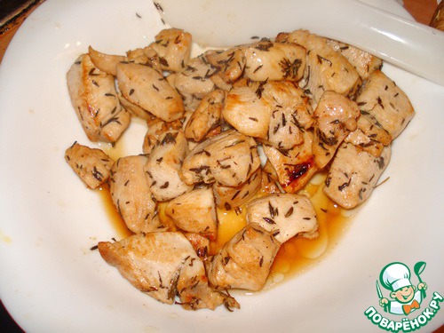 Курицу нарезать, посолить, поперчить, добавить тимьян.
