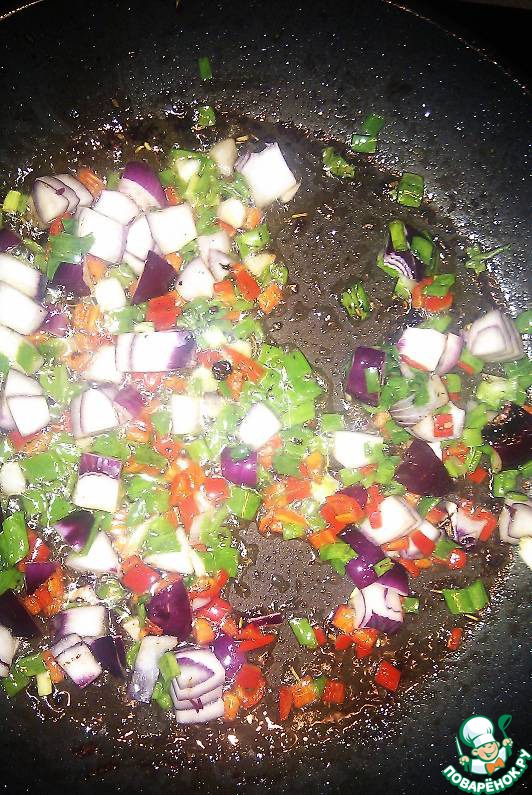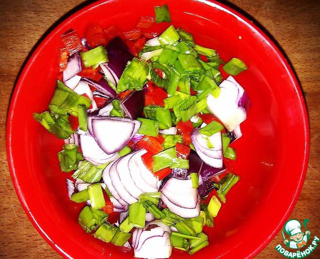 Режем лук небольшими кубиками, чили очищаем от семечек и тоже нарезаем.