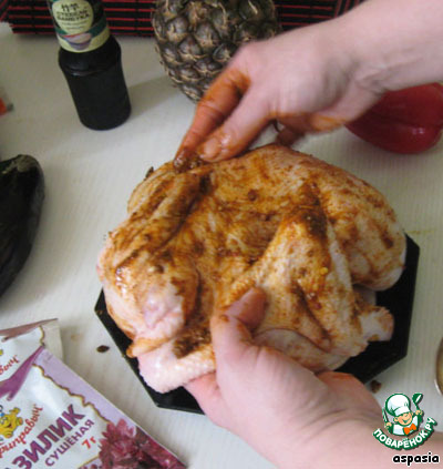 | Курица запекается в духовке и подается гостям либо целиком, либо порционно с гарниром из риса цветного. Рецепт модернизировала для конкурса - блюдо получается ВСЕГДА вкусно, сочно и красиво. Гарниры разнообразны - на любой вкус, но для данного рецепта использовала только компоненты конкурса. |