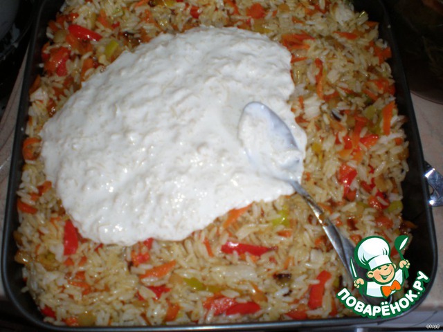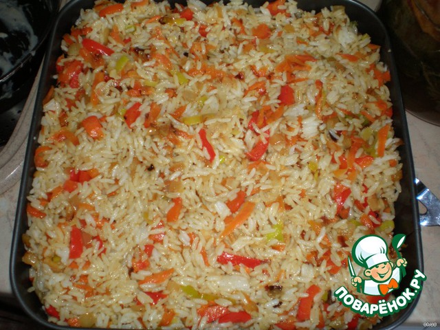 рис промыть, залить 4 стаканами горячей воды, добавить 2 ст. л. сливочного масла, перемешать и поcтавить в духовку на 20-30 мин.