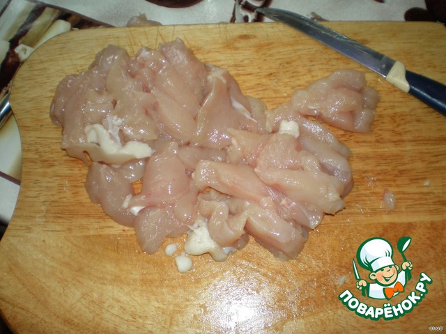 Куриное филе вымыть и нарезать тонкими пластинами