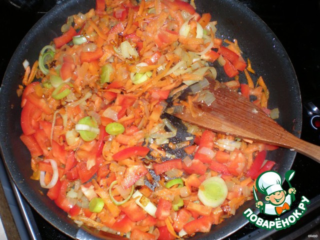 Добавить морковь, лук-порей, затем перец, потушить.