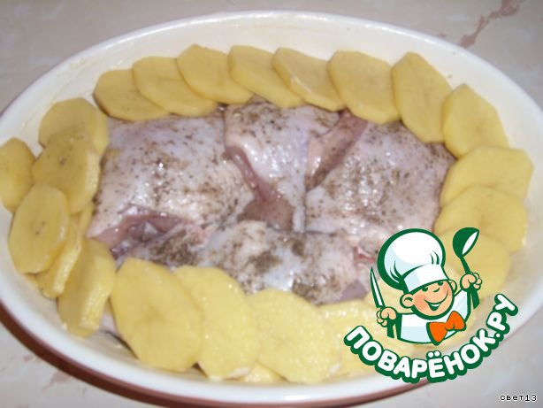 На смазанный маслом лист с высокими бортами укладываем окорочка, вокруг их кружочки картофеля и запекаем в духовке 200* С, почти до готовности.