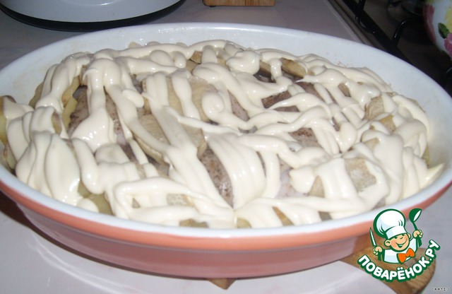 После этого картофель посыпаем солью, заливаем майонезом и ставим в духовку ещё на 15-20 минут.