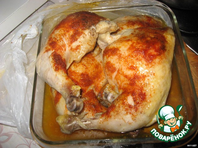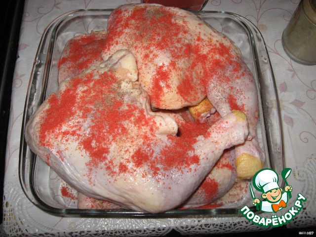 Достаете вашу курятинку из морозилки, кладете в огнеупорную форму, присаливаете, посыпаете черным перцем и паприкой (это придаст ей аромат и цвет).