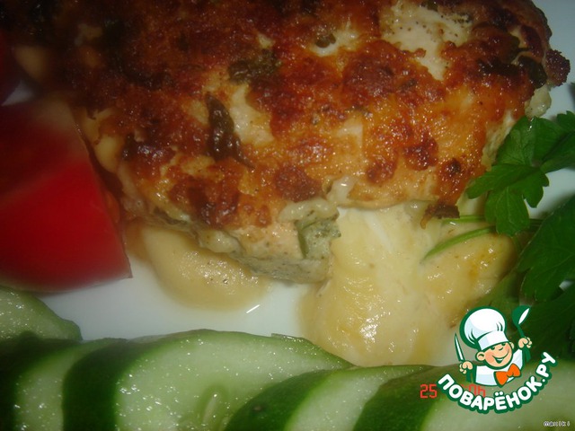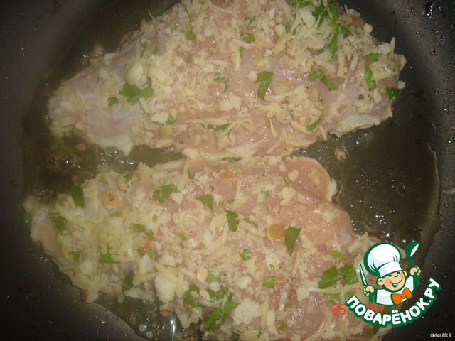 Филе разрезала пополам, исколола вилкой (в решето не превращала), сделала глубокий надрез и вложила в полученный кармашек ломтик сыра. Запанировала в яйце и в хлебных крошках с натертым сыром и петрушкой. Обжарила на сковородке до корочки, когда перевернула накрыла крышкой.