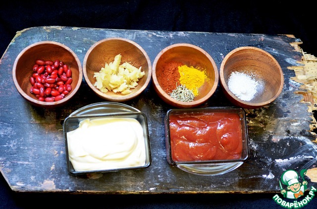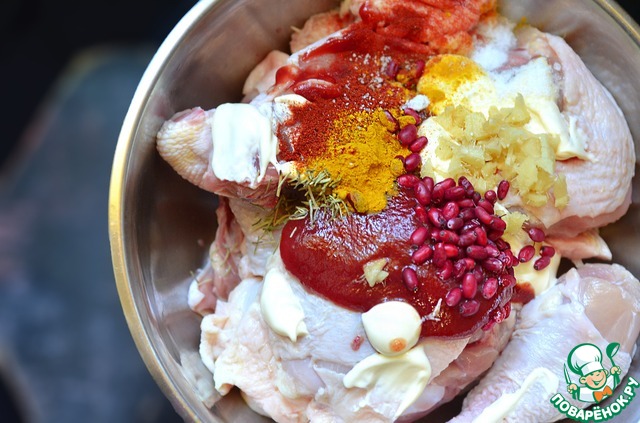 Замаринуйте курицу с утра. Для маринада нужно взять: почищенный и нарезанный корень имбиря. специи (куркума, паприка сладкая и розмарин), соль, майонез и кетчуп.