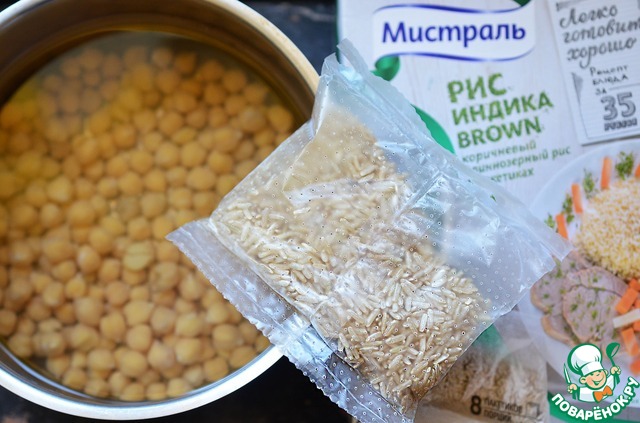 Рис я буду отваривать вместе с замоченным нутом. Нут в нашем доме всегда есть уже замоченный и замороженный (меня этому научили в Тунисе). Воду подсолить по вкусу. Рис примет на себя ещё вкусовой оттенок нута. Их можно сварить вместе, что я раньше и делала. Но для старшего сына, который не ест нут, мне приходилось как Золушке отделять рис от нута. С пакетиком всё проще! Удобно, вкусно и практично. Рис Индика Браун от Мистраль варится 35 минут.