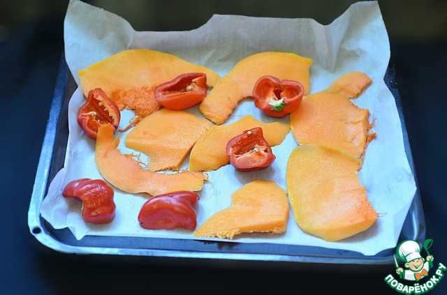 Разогреть духовку. Пока она разогревается, на противень выложить овощи: нарезанную большими кусками тыкву и болгарской перец.