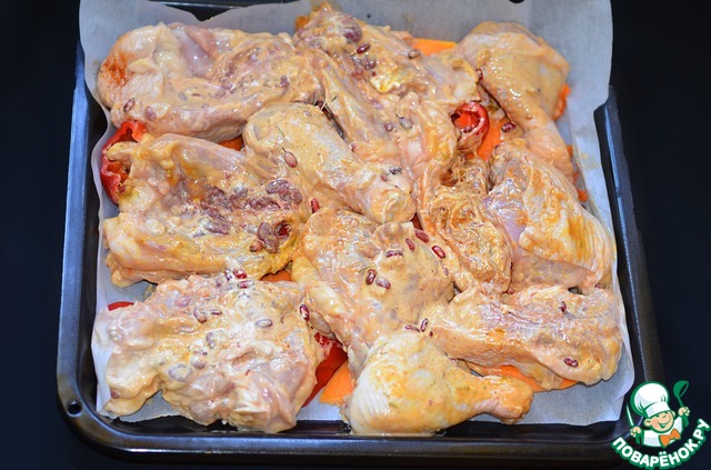 Сверху уложить промариновавшуюся имбирную курицу.