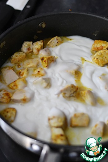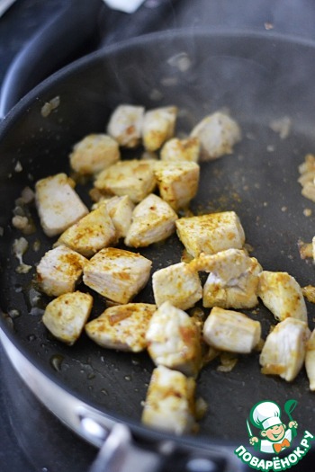 Куриное филе нарезать на кубики, добавить к луку, обжарить до румяности. Посолить, поперчить, добавить порошок карри.