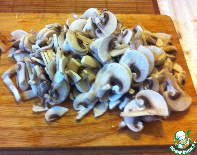 Шампиньоны также порезать и отправить к грибам, посолив, поперчив. Готовить их на среднем огне около 8-10 мин., помешивая, пока не испарится лишняя жидкость, а грибы не будут готовы.