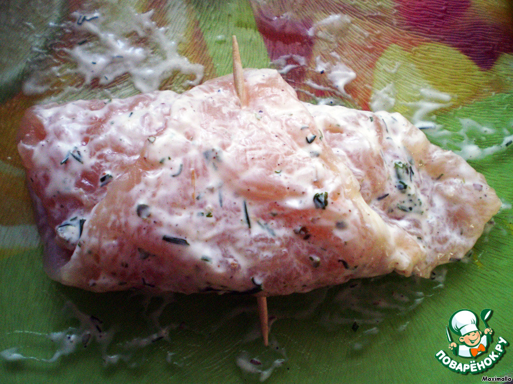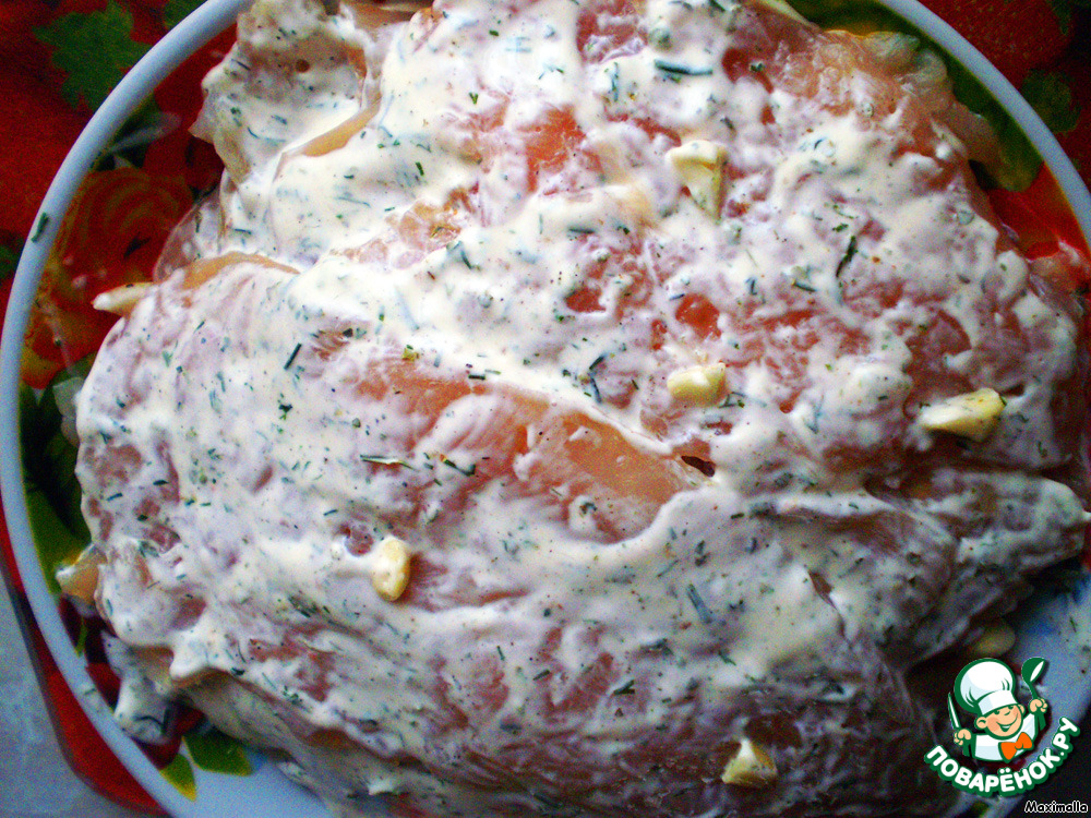 Смешать майонез с солью, перцем, майораном, укропом и измельченным чесноком (нарезать мелко или выдавить через чесночницу). Филе разрезать вдоль пополам или на 2-3 части, толщиной где-то 7мм., отбить, сложить в миску, каждый кусок смазывая майонезной смесью. Поставить мариноваться в холодильник на 2 часа, можно и меньше.