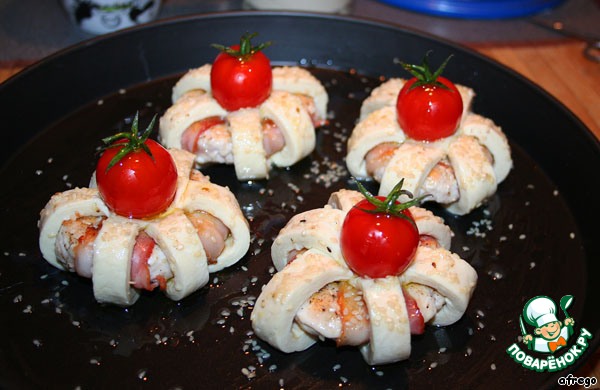 Тесто нарезала на 12 полосок, разложила по 3 полоски снежинкой, сверху придавила середину, затем сверху положила куриные «бублики» и обернула полосками теста.