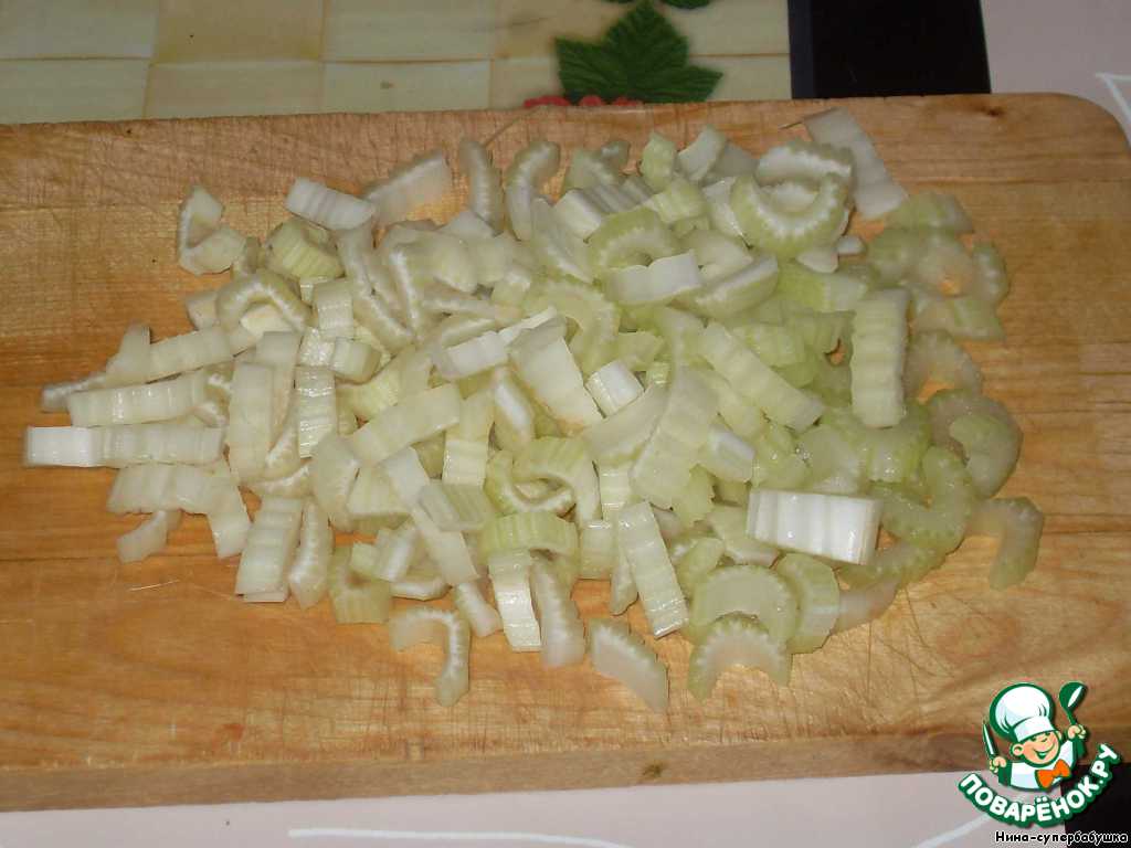 Черешки сельдерея вымыть, очистить от жестких жилок и нарезать поперек на ломтики.