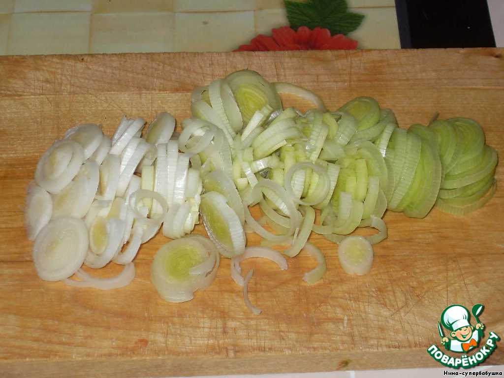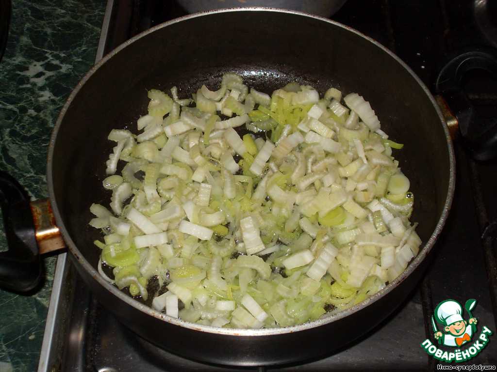 В глубоком сотейнике разогреть пару столовых ложек растительного масла и слегка обжарить порей... до мягкости.