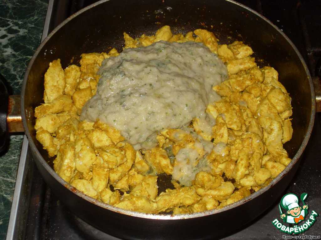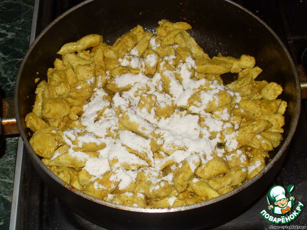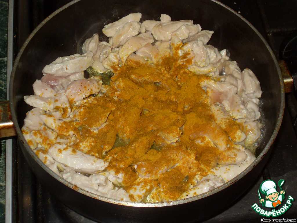 Мясо обжарить, не допуская подрумянивания, посыпать карри.