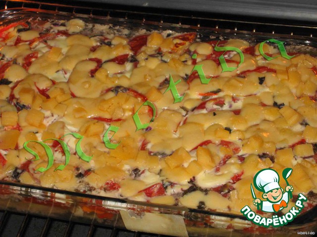 Посыпать сыром (натереть на терке или порезать мелкими кубиками) и убрать еще минут на 20 в духовку (температуру понизить до 200*С).