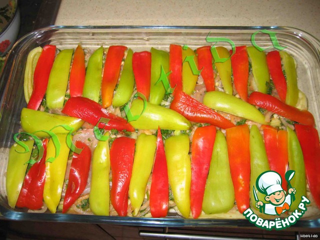Перец очистить и порезать полосками, выложить ряд на курицу.