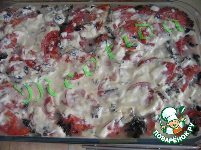 Помазать равномерно сметаной и залить водой (можно и без воды, тогда надо маринада сделать побольше, чтобы его было где-то раза в три больше).