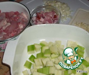 В форму поместить грудинку, кабачок и лук, жарить на сильном огне 8 мин. , периодически помешивая, пока не начнет подрумяниваться. Вновь положить курицу в форму, добавить чеснок и майоран, жарить 1 мин.