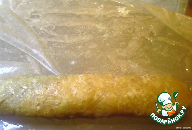 Свернуть рулетом (как показано на фото) и в эту же бумагу завернуть - положить на противень.