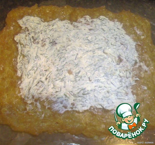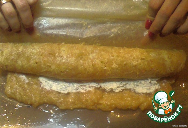 Намочить бумагу для выпечки (можно это сделать на пищевой пленке, смазанной подсолнечным маслом, но все равно придется рулет заворачивать или в фольгу, или в ту же бумагу для выпечки), уложить половину фарша и мокрыми руками разровнять, толщиной в палец. Сверху выложить половину сырной массы и тоже мокрыми руками разровнять по поверхности.