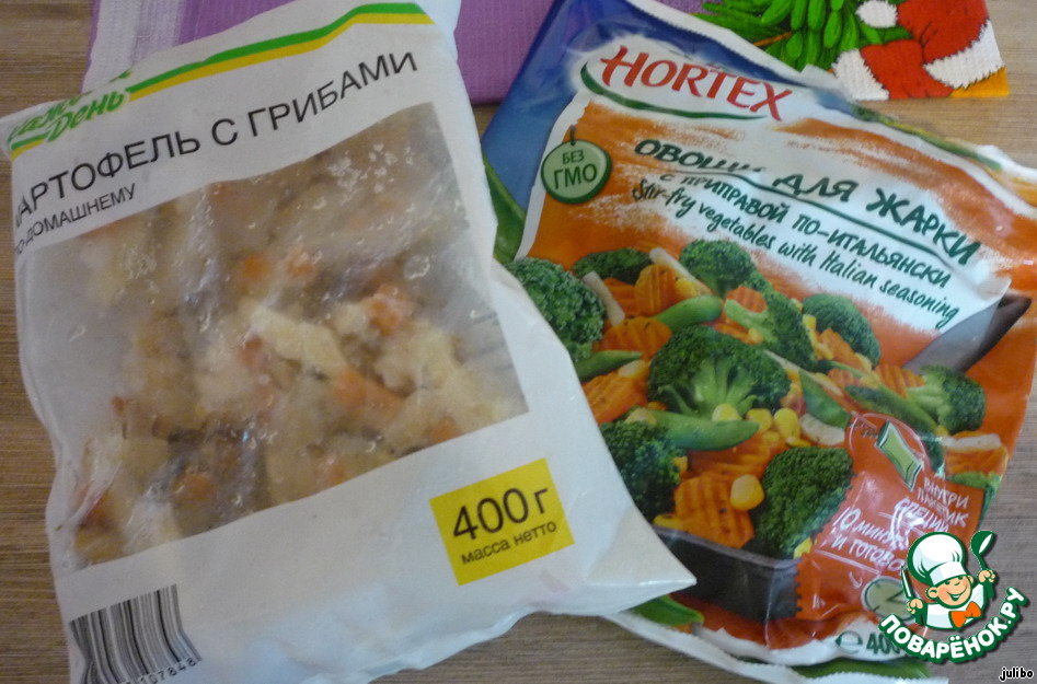 Взять две пачки замороженных овощей (разных),но желательно, чтобы присутствовали грибы. Меняя овощи, меняем вкус блюда - широкое поле деятельности))).