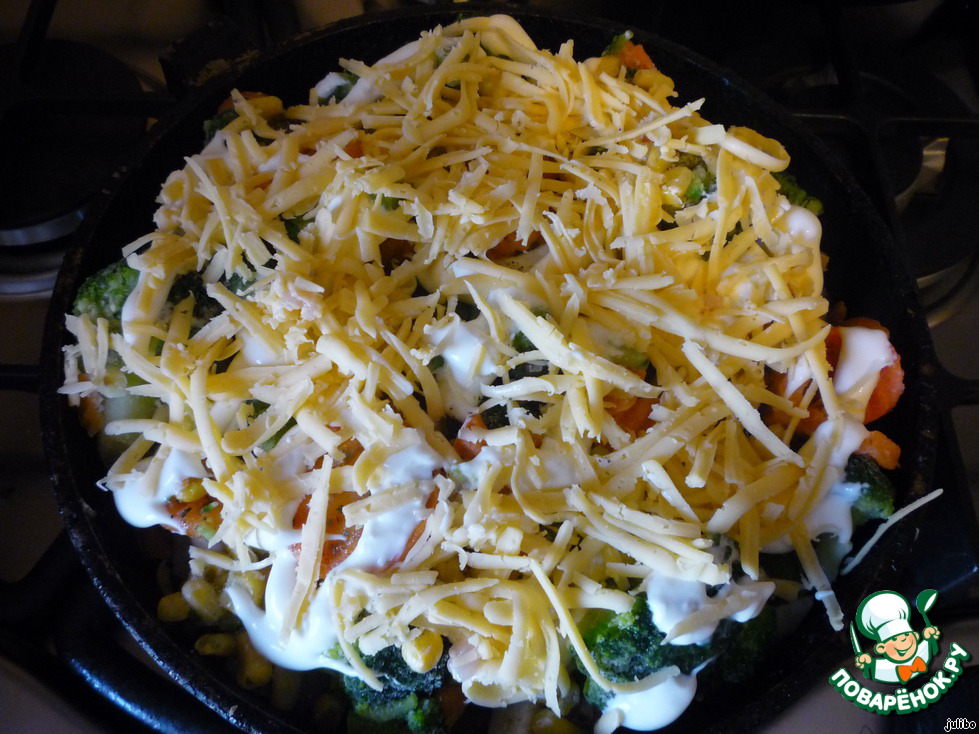 Выложить на курицу овощи из одной пачки (не размораживая), подсолить, слегка смазать майонезом, затем то же самое проделать со второй пачкой. Сверху посыпать натертым сыром. Отправить сковороду в разогретую духовку минут на 40. Можно сначала накрыть крышкой, минут на 20, затем снять ее.