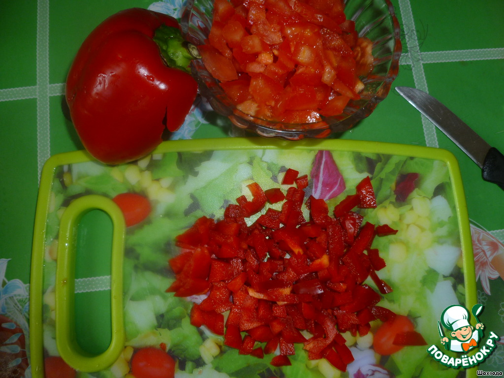 Помидор, сладкий и острый перец мелко нарезать (я стручок острого перца заменила щепоткой молотого перца)
