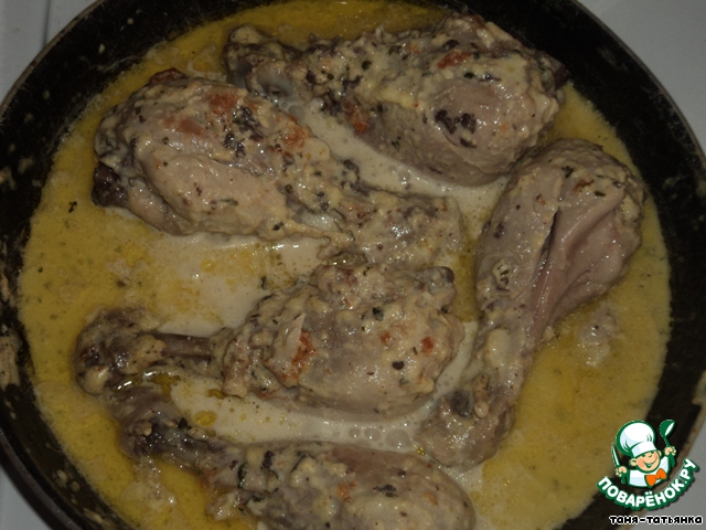 Выкладываем голень в сковороду и слегка обжариваем на сливочном масле, добавляем молоко, сыр, чеснок, карри, петрушку и соль.