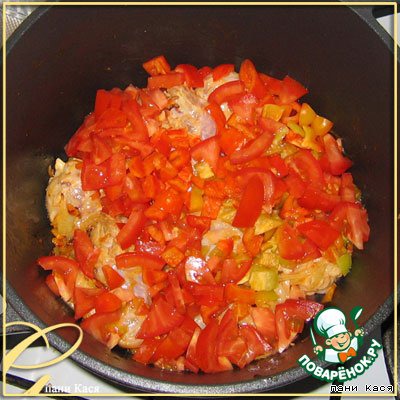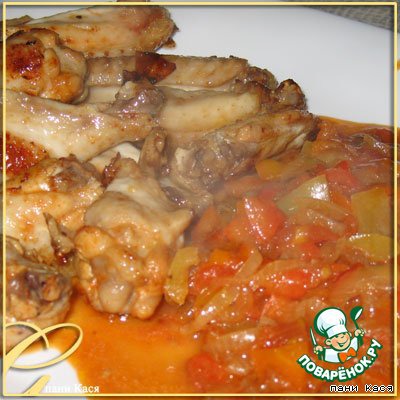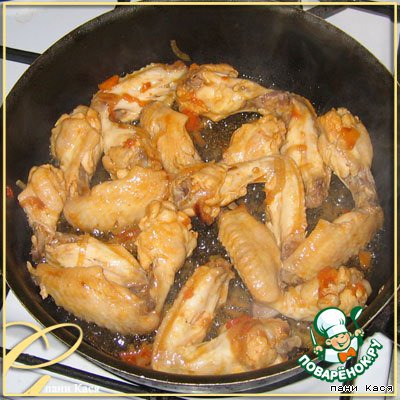 Kидаем туда крылышки и сверху - помидорки и перец, тушим минут 20-30.